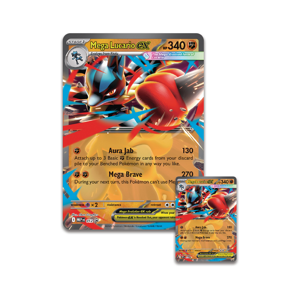 - 1x carta promocional gigante apresentando Mega Lucario ex.