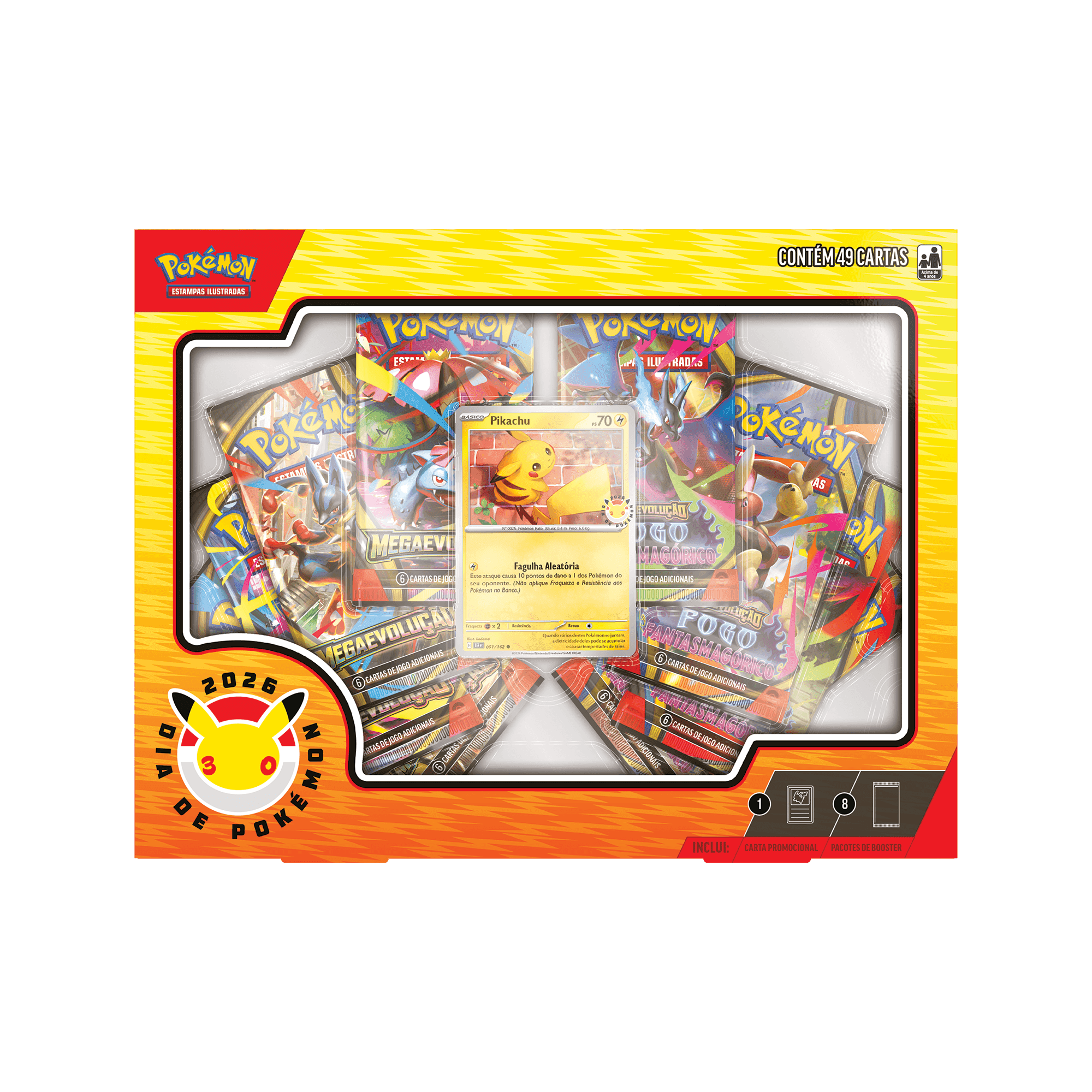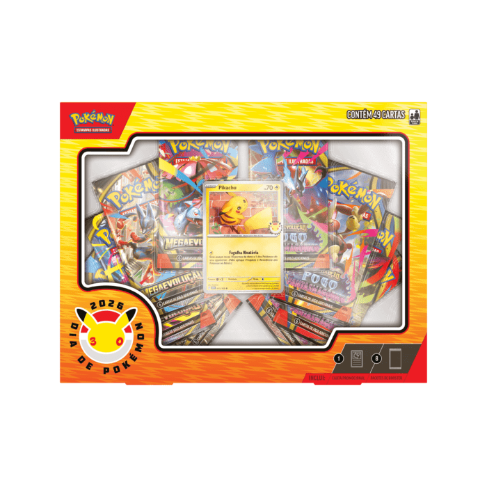 A Box Coleção Dia de Pokémon 2026 chega para celebrar uma das datas mais importantes do calendário Pokémon: o Pokémon Day, agora em dose dupla com o marco dos 30 anos da franquia. Este produto oficial do Pokémon TCG foi preparado para fãs novos e veteranos que querem adicionar itens comemorativos e conteúdo de jogo real à sua coleção. Em sua composição você encontra uma carta promocional de Pikachu com selo especial do Pokémon Day e uma seleção de booster packs de expansões variadas, tudo lacrado para preservar o valor colecionável e a experiência de abertura.