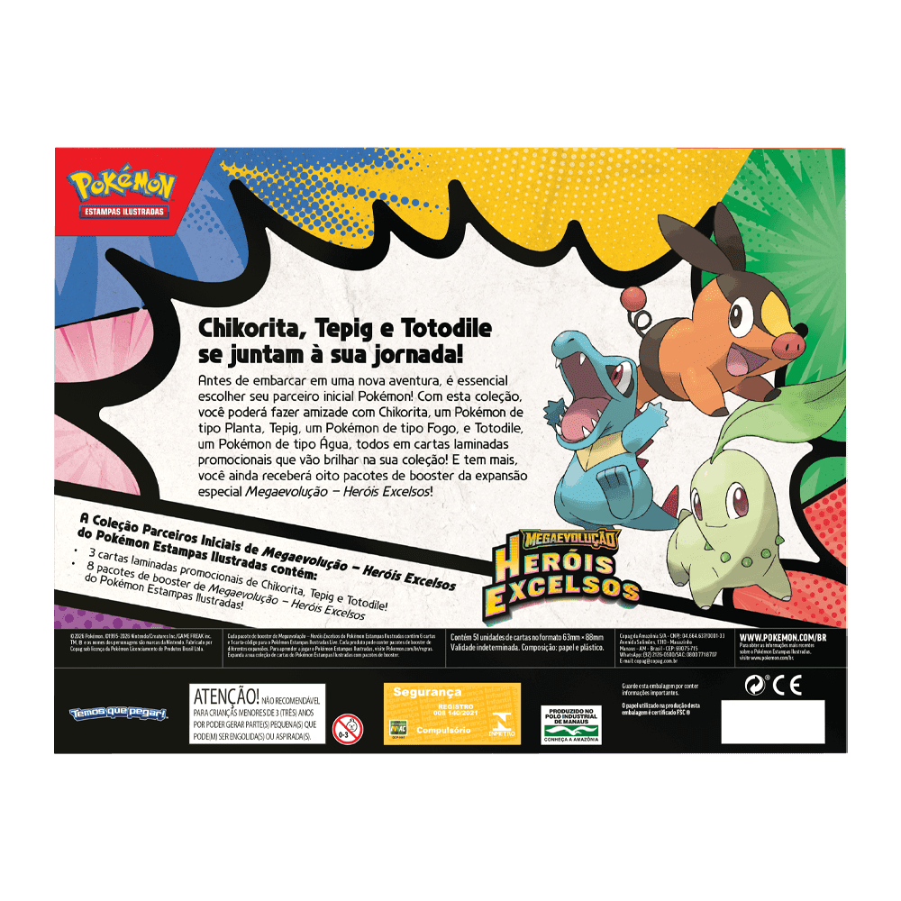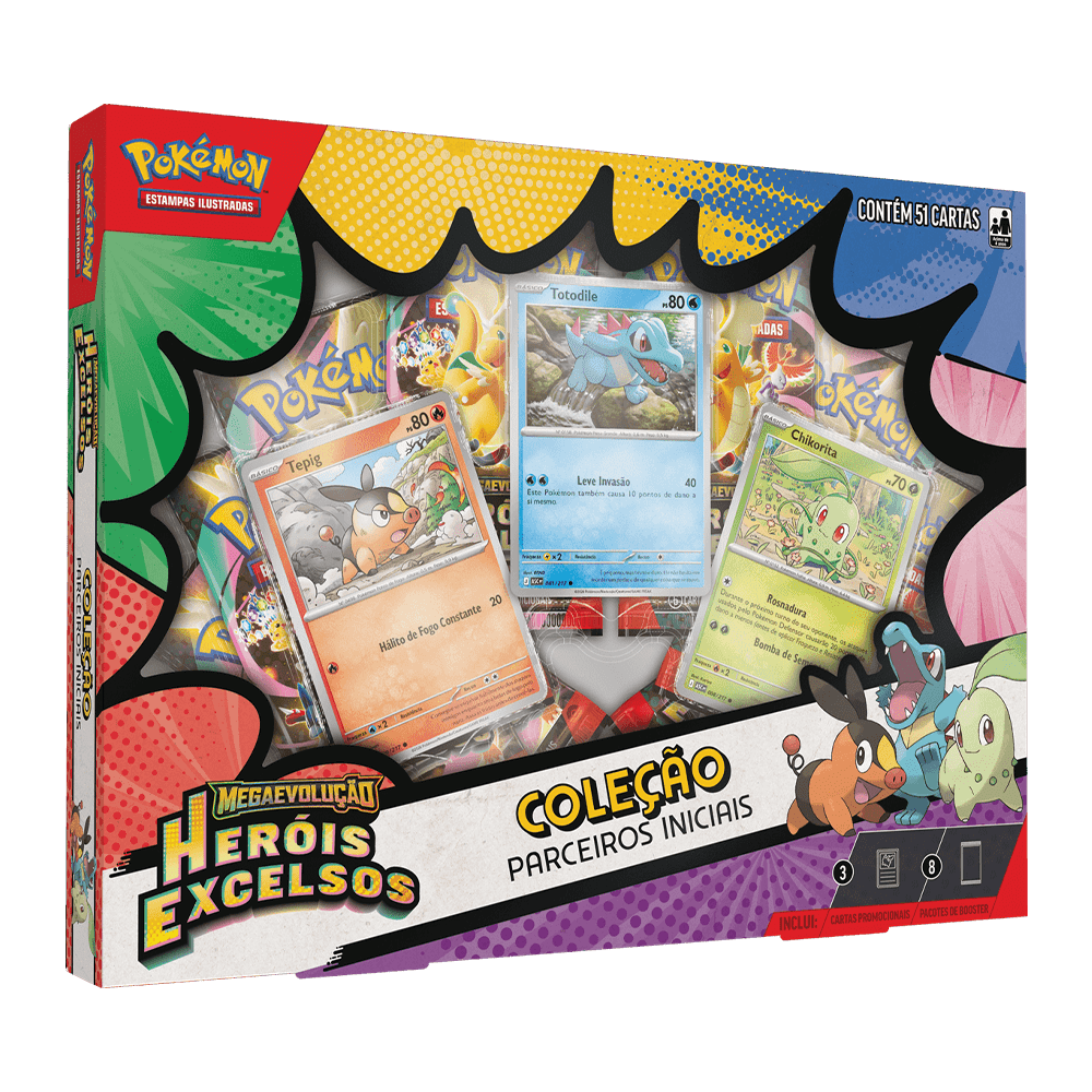 Pokémon Box Coleção Parceiros Iniciais Heróis Excelsos é uma coleção pensada para quem valoriza tanto a construção de deck quanto o apelo artístico das cartas promocionais. Inspirada nos Pokémon iniciais que marcaram gerações, esta box combina itens exclusivos com boosters da expansão Heróis Excelsos, ampliando as possibilidades estratégicas e fortalecendo sua coleção.